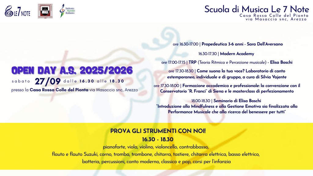 Sabato 27 settembre, dalle ore 16.30 alle ore 18.30 presso la sede della Scuola di Musica Le 7 Note all’interno del colle del Pionta, avrà luogo l’Open Day.