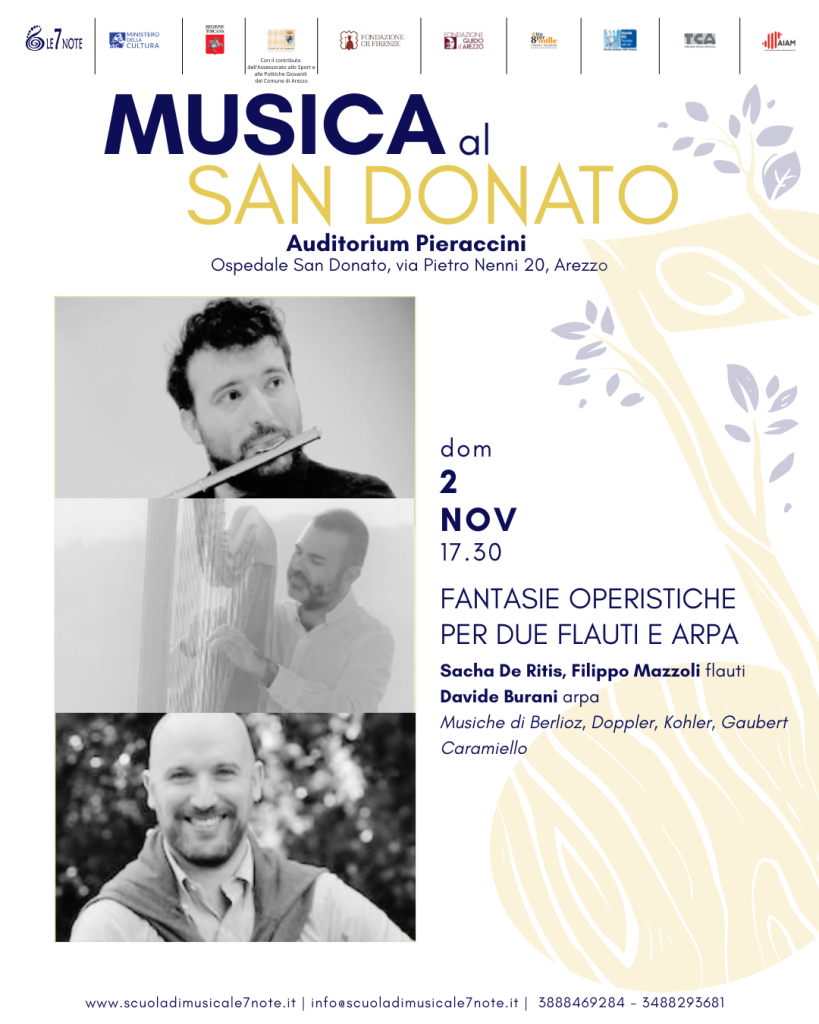 Domenica 2 novembre, alle ore 17.30, presso l’Auditorium Pieraccini dell’Ospedale di Arezzo, appuntamento con Fantasie operistiche per due flauti e arpa con Sacha De Ritis, Filippo Mazzoli flauti e Davide Burani all’arpa.